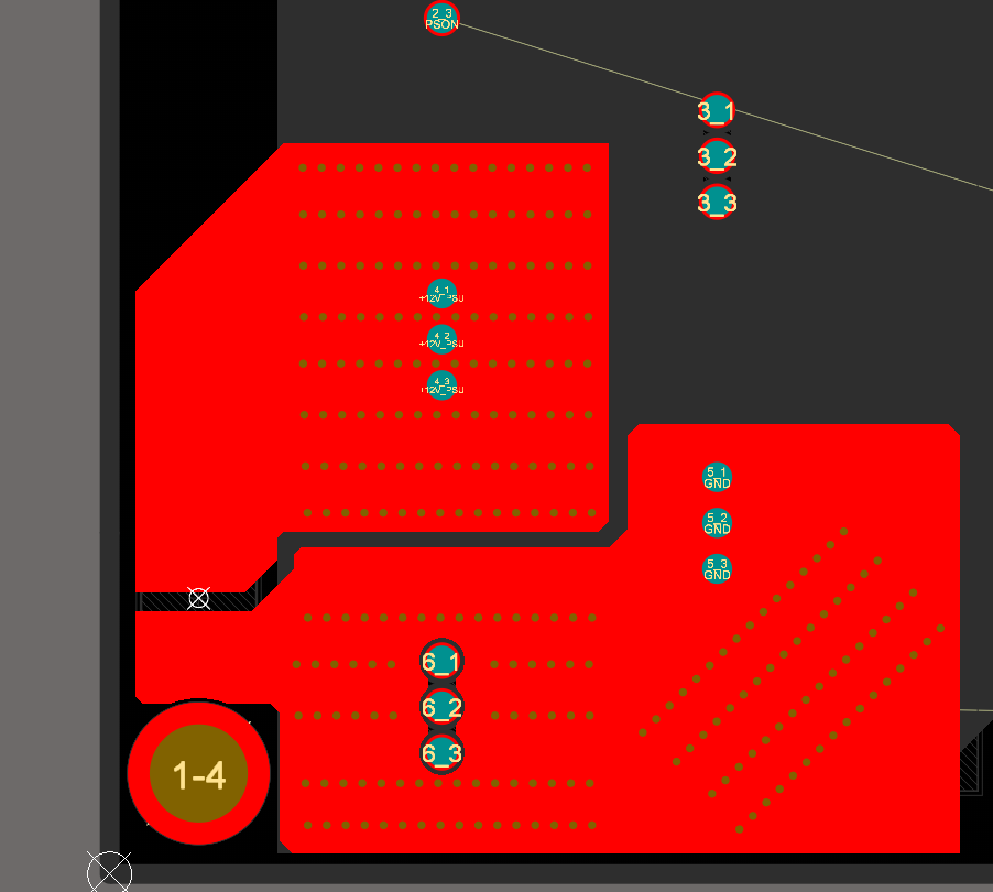 Hi, I'm designing a pcb (4oz copper) that will carry 55A at 12v across it. Power (+12V_PSU) comes in from a through hole connector (Top Layer) well rated for that amount and then it connects to a solid power plane at the bottom (hand solder). I ran the Altium Keysight power analyzer and it was flagging the through vias for the connector pins as having to much current. So I added a bunch of stitching vias from the top layer to the bottom layer to make it happy, but is this to many stitching vias? and is the Keysight power analyzer not taking into account the current capacity of the pins of the connector to the bottom layer?Thank you