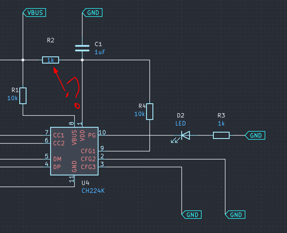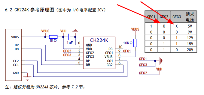 Here is an (unofficial) English vesion of the datasheet: https://www.laskakit.cz/user/related_files/ch224ds1.pdfCfg2 and Cfg3 are "do not care" for 5V. That means they can be either high or low.The resistor is there as the Vdd input for the CH224K should be low and not connected directly to Vbus that can go up to 22V. The excess voltage is dissipated in the resistor.