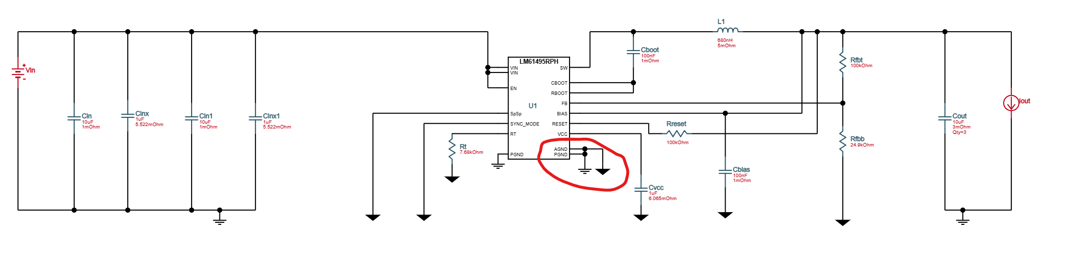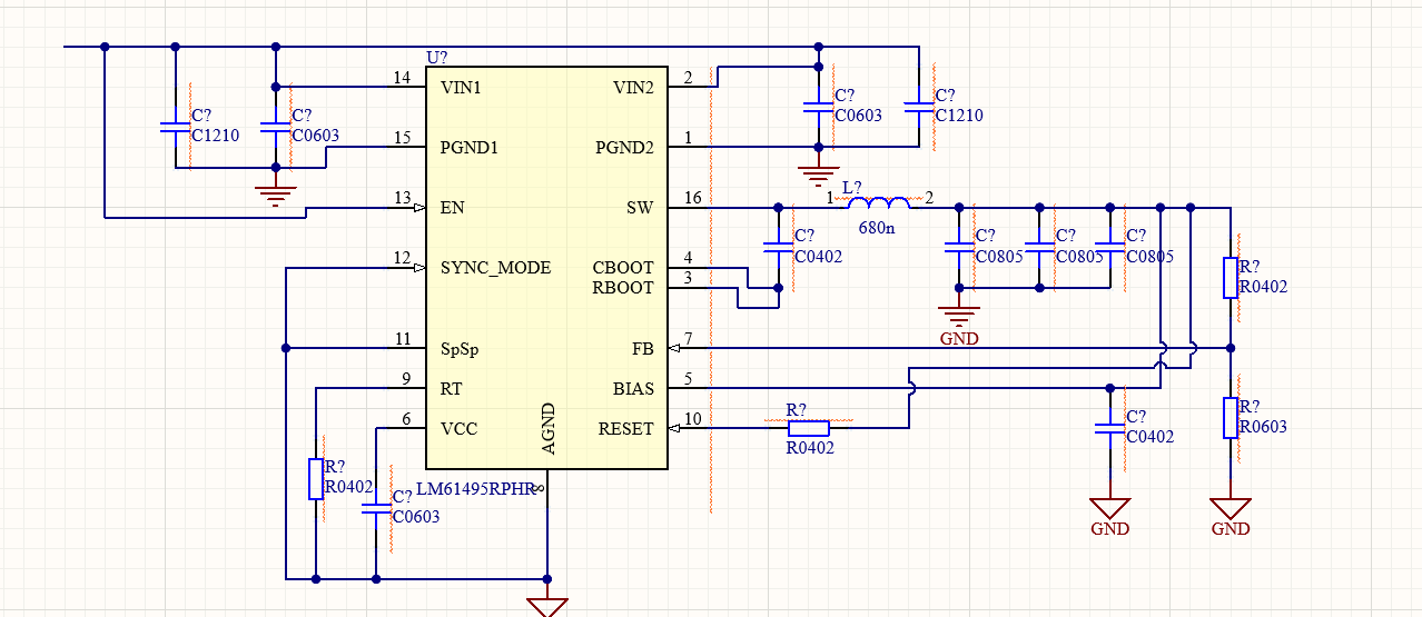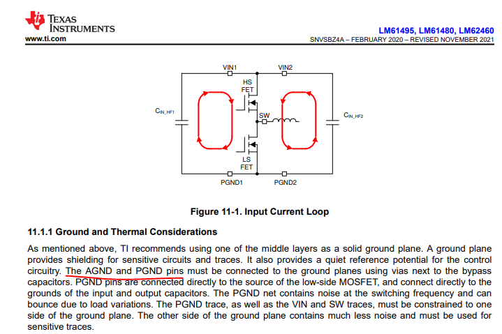 Hi I'm using webench to try and wire this buck converter schematic and it seems like they split the ground and I'm a bit confused because on the right hand side, they connect PGND and AGND together (as circled). This is my wiring schematic on the right. Please let me know if my wiring is correct. I'd also appreciate if you point any other connection errors as well thank you.